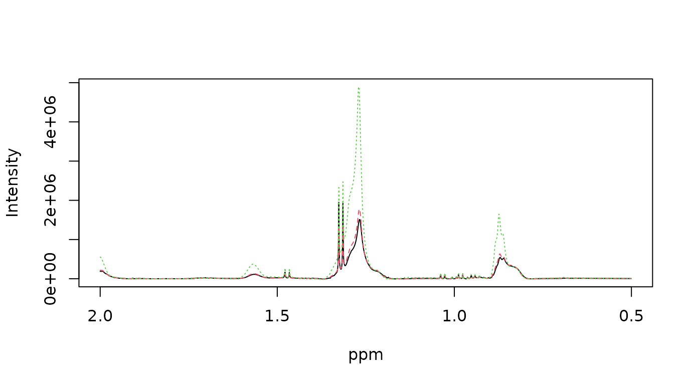 #> [1] "X" "ppm" "meta"The following examples illustrate several commonly used apodisation