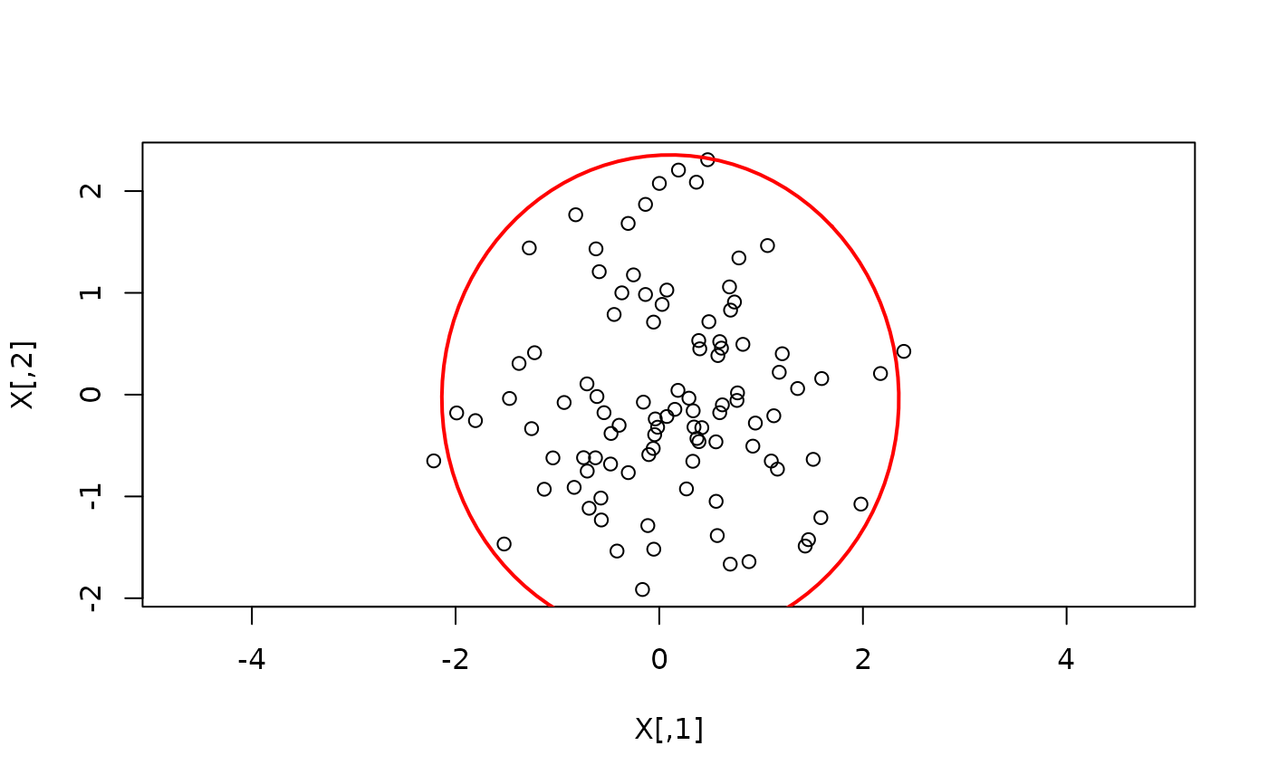 Computes the Hotelling T^2 statistic defining a multivariate confidence region for a set of observations. The region corresponds to an ellipsoid in p-dimensional space and is commonly visualised as an ellipse in two-dimensional (OPLS) score plots.